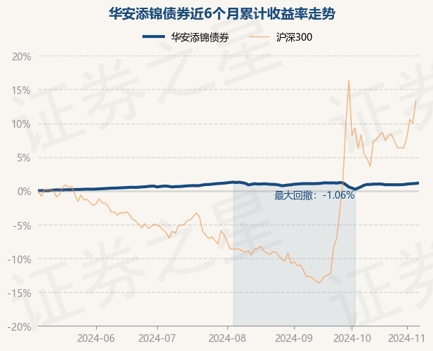 证券之星消息,11月7日,华安添锦债券最新单位净值为1.0404元,累计净值为1.0584元,较前一交易日上涨0.07%。历史数据显示该基金近1个月上涨0.6%,近3个月下跌0.11%,近6个月上涨1.16%,近1年上涨3.63%。该基金近6个月的累计收益率走势如下图: