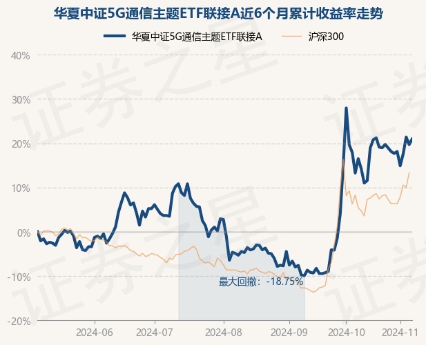 证券之星消息,11月7日,华夏中证5G通信主题ETF联接A最新单位净值为1.1712元,累计净值为1.1712元,较前一交易日上涨1.07%。历史数据显示该基金近1个月上涨5.07%,近3个月上涨27.18%,近6个月上涨20.98%,近1年上涨23.78%。该基金近6个月的累计收益率走势如下图: