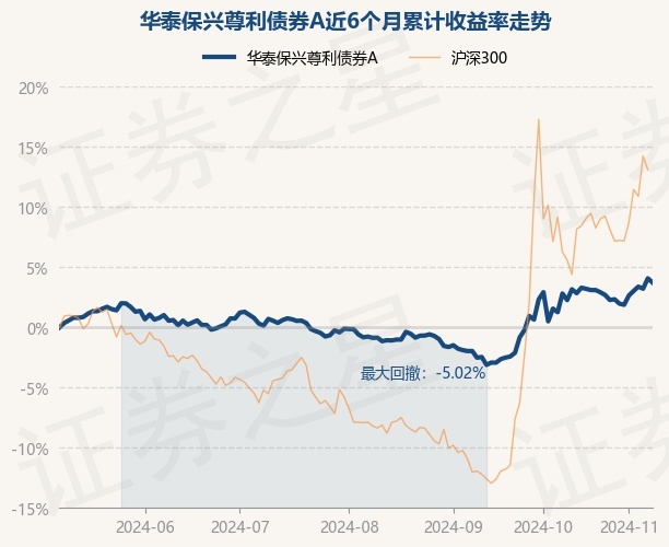 证券之星消息,11月8日,华泰保兴尊利债券A最新单位净值为1.2459元,累计净值为1.4092元,较前一交易日下跌0.34%。历史数据显示该基金近1个月上涨0.79%,近3个月上涨4.64%,近6个月上涨3.74%,近1年上涨11.33%。该基金近6个月的累计收益率走势如下图: