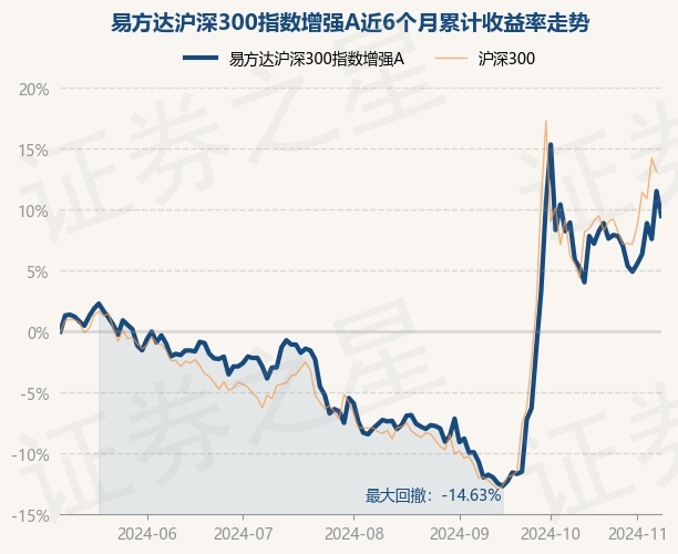 证券之星消息,11月8日,易方达沪深300指数增强A最新单位净值为0.8198元,累计净值为0.8198元,较前一交易日下跌1.83%。历史数据显示该基金近1个月下跌5.08%,近3个月上涨18.5%,近6个月上涨9.48%,近1年上涨20.75%。该基金近6个月的累计收益率走势如下图: