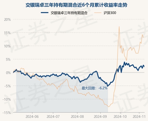 证券之星消息,11月8日,交银瑞卓三年持有期混合最新单位净值为0.9032元,累计净值为0.9032元,较前一交易日下跌0.47%。历史数据显示该基金近1个月下跌0.41%,近3个月上涨5.49%,近6个月上涨2.21%,近1年上涨6.16%。该基金近6个月的累计收益率走势如下图:
