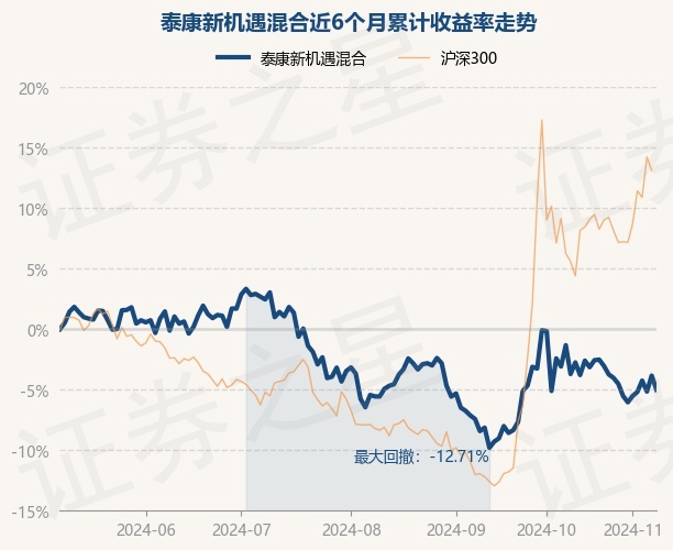 证券之星消息,11月8日,泰康新机遇混合最新单位净值为1.134元,累计净值为1.501元,较前一交易日下跌1.21%。历史数据显示该基金近1个月下跌4.85%,近3个月上涨0.59%,近6个月下跌5.0%,近1年上涨3.52%。该基金近6个月的累计收益率走势如下图: