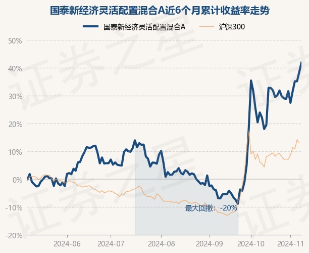 证券之星消息,11月8日,国泰新经济灵活配置混合A最新单位净值为2.483元,累计净值为3.389元,较前一交易日上涨2.43%。历史数据显示该基金近1个月上涨4.72%,近3个月上涨39.57%,近6个月上涨41.89%,近1年上涨17.01%。该基金近6个月的累计收益率走势如下图: