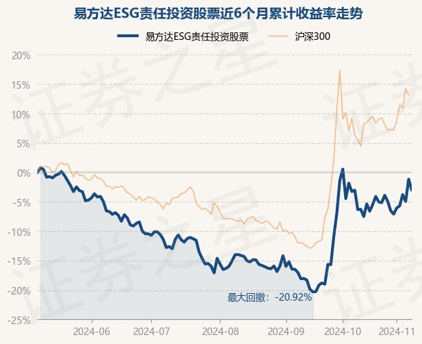 证券之星消息,11月8日,易方达ESG责任投资股票最新单位净值为1.5656元,累计净值为1.5656元,较前一交易日下跌1.81%。历史数据显示该基金近1个月下跌3.48%,近3个月上涨12.85%,近6个月下跌2.97%,近1年上涨4.48%。该基金近6个月的累计收益率走势如下图: