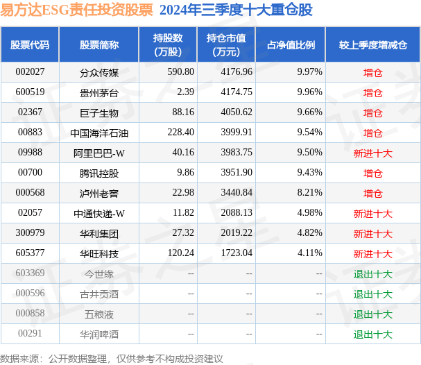 易方达ESG责任投资股票为股票型基金,根据最新一期基金季报显示,该基金资产配置:股票占净值比89.63%,无债券类资产,现金占净值比14.04%。基金十大重仓股如下: