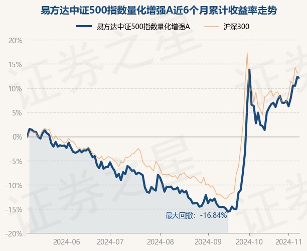 证券之星消息,11月8日,易方达中证500指数量化增强A最新单位净值为0.9578元,累计净值为0.9578元,较前一交易日下跌0.24%。历史数据显示该基金近1个月下跌1.53%,近3个月上涨25.04%,近6个月上涨12.08%,近1年上涨14.2%。该基金近6个月的累计收益率走势如下图: