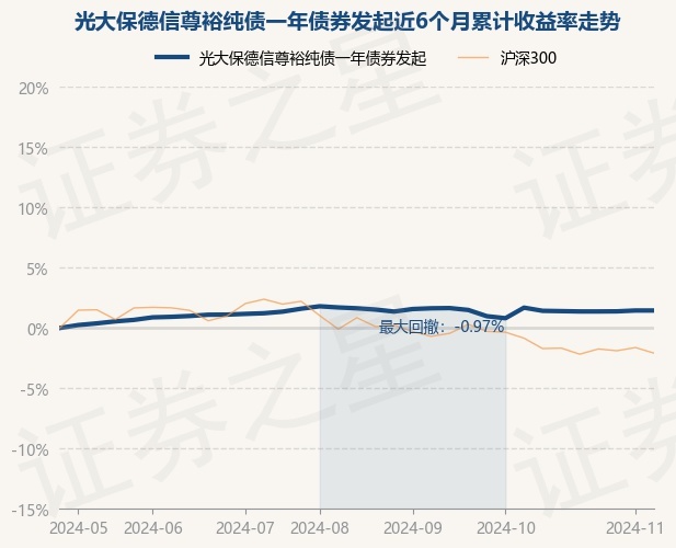 证券之星消息,11月8日,光大保德信尊裕纯债一年债券发起最新单位净值为1.1631元,累计净值为1.184元,较前一交易日上涨0.0%。历史数据显示该基金近1个月上涨0.74%,近3个月下跌0.08%,近6个月上涨1.72%,近1年上涨4.2%。该基金近6个月的累计收益率走势如下图: