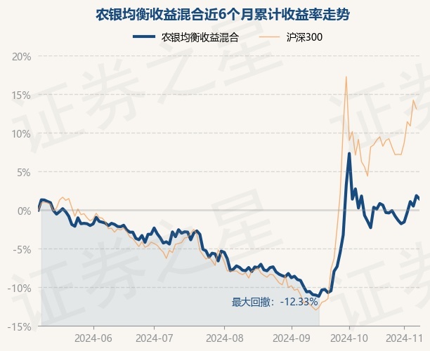 证券之星消息,11月8日,农银均衡收益混合最新单位净值为0.8231元,累计净值为0.8231元,较前一交易日下跌0.41%。历史数据显示该基金近1个月下跌5.48%,近3个月上涨9.59%,近6个月上涨1.45%,近1年上涨6.9%。该基金近6个月的累计收益率走势如下图: