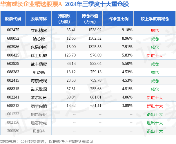 华富成长企业精选股票A为股票型基金,根据最新一期基金季报显示,该基金资产配置:股票占净值比94.55%,债券占净值比0.61%,现金占净值比5.03%。基金十大重仓股如下: