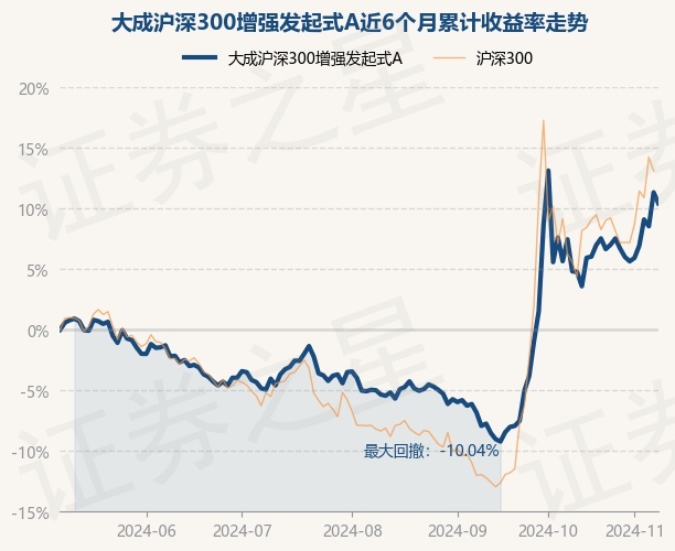 证券之星消息,11月8日,大成沪深300增强发起式A最新单位净值为0.8543元,累计净值为0.8543元,较前一交易日下跌0.81%。历史数据显示该基金近1个月下跌2.39%,近3个月上涨16.23%,近6个月上涨10.43%,近1年上涨16.77%。该基金近6个月的累计收益率走势如下图: