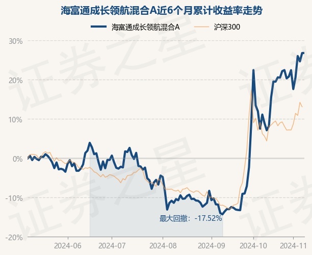 证券之星消息,11月8日,海富通成长领航混合A最新单位净值为0.7015元,累计净值为0.7015元,较前一交易日上涨0.0%。历史数据显示该基金近1个月上涨3.8%,近3个月上涨43.4%,近6个月上涨27.11%,近1年上涨10.98%。该基金近6个月的累计收益率走势如下图: