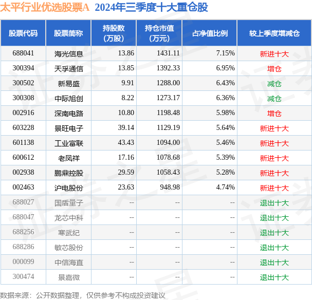 太平行业优选股票A为股票型基金,根据最新一期基金季报显示,该基金资产配置:股票占净值比89.25%,无债券类资产,现金占净值比7.75%。基金十大重仓股如下: