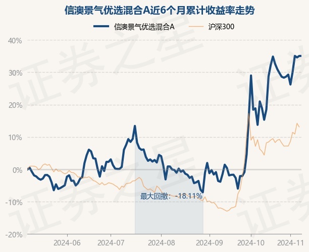 证券之星消息,11月8日,信澳景气优选混合A最新单位净值为0.9401元,累计净值为0.9401元,较前一交易日上涨0.0%。历史数据显示该基金近1个月上涨6.21%,近3个月上涨37.12%,近6个月上涨37.04%,近1年上涨22.22%。该基金近6个月的累计收益率走势如下图: