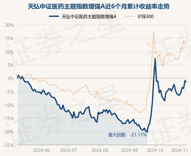 证券之星消息,11月8日,天弘中证医药主题指数增强A最新单位净值为0.7102元,累计净值为0.7102元,较前一交易日下跌0.53%。历史数据显示该基金近1个月下跌8.17%,近3个月上涨11.72%,近6个月下跌1.48%,近1年下跌11.31%。该基金近6个月的累计收益率走势如下图: