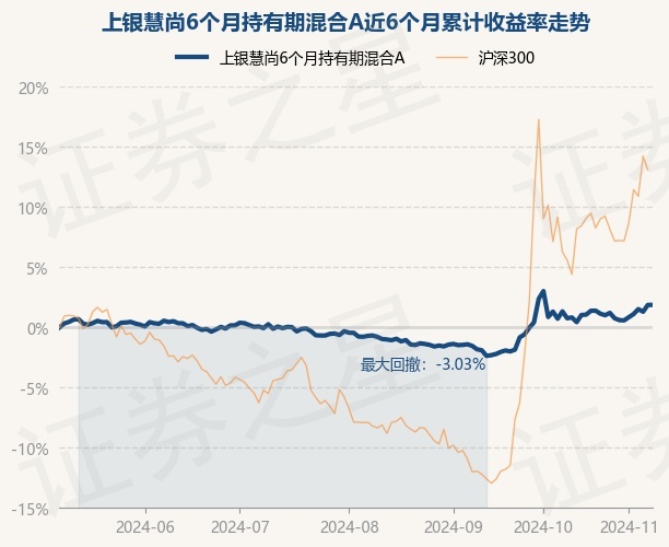 证券之星消息,11月8日,上银慧尚6个月持有期混合A最新单位净值为1.0452元,累计净值为1.0452元,较前一交易日上涨0.0%。历史数据显示该基金近1个月下跌1.23%,近3个月上涨2.44%,近6个月上涨1.75%,近1年上涨3.61%。该基金近6个月的累计收益率走势如下图: