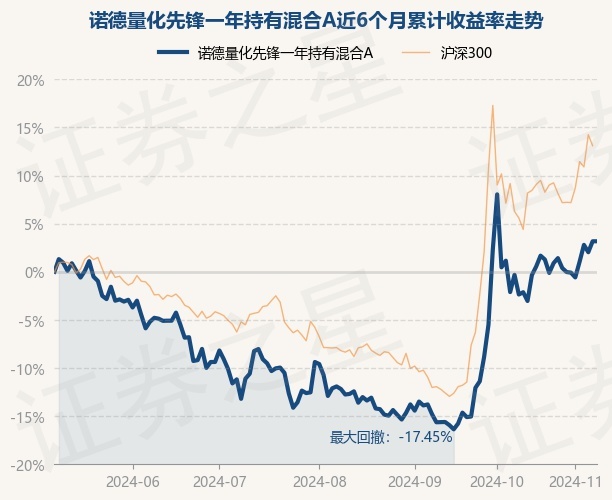 证券之星消息,11月8日,诺德量化先锋一年持有混合A最新单位净值为0.6899元,累计净值为0.6899元,较前一交易日上涨0.0%。历史数据显示该基金近1个月下跌4.55%,近3个月上涨17.43%,近6个月上涨3.12%,近1年上涨1.8%。该基金近6个月的累计收益率走势如下图:
