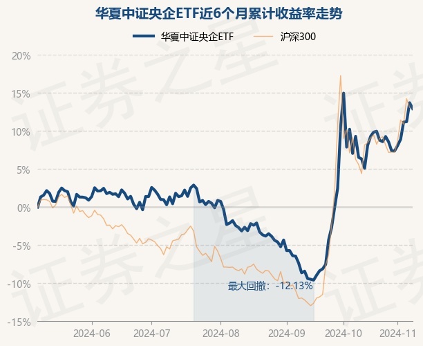 证券之星消息,11月8日,华夏中证央企ETF最新单位净值为1.413元,累计净值为1.413元,较前一交易日下跌0.67%。历史数据显示该基金近1个月下跌1.76%,近3个月上涨15.75%,近6个月上涨12.95%,近1年上涨17.75%。该基金近6个月的累计收益率走势如下图: