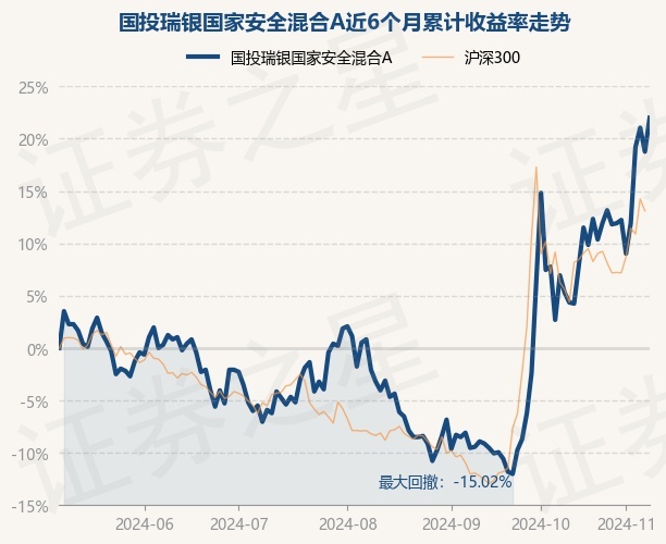 证券之星消息,11月8日,国投瑞银国家安全混合A最新单位净值为1.1771元,累计净值为1.3361元,较前一交易日上涨2.71%。历史数据显示该基金近1个月上涨6.24%,近3个月上涨24.56%,近6个月上涨21.98%,近1年上涨19.87%。该基金近6个月的累计收益率走势如下图: