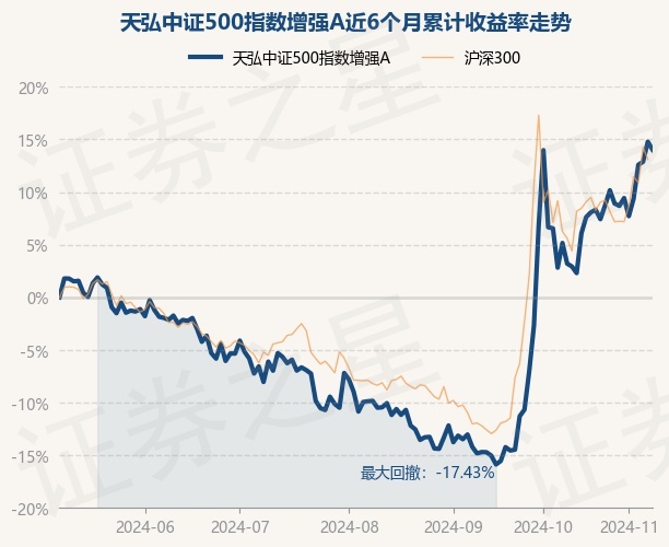 证券之星消息,11月8日,天弘中证500指数增强A最新单位净值为1.2422元,累计净值为1.2422元,较前一交易日下跌0.66%。历史数据显示该基金近1个月上涨0.04%,近3个月上涨26.45%,近6个月上涨14.02%,近1年上涨14.04%。该基金近6个月的累计收益率走势如下图: