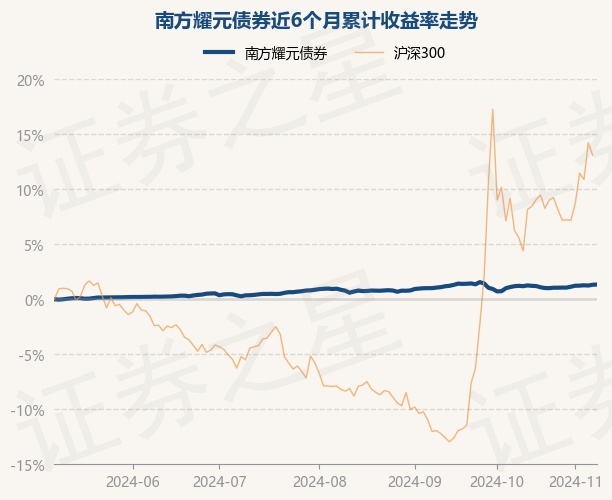证券之星消息,11月8日,南方耀元债券最新单位净值为1.0209元,累计净值为1.0539元,较前一交易日上涨0.02%。历史数据显示该基金近1个月上涨0.62%,近3个月上涨0.47%,近6个月上涨1.34%,近1年上涨3.22%。该基金近6个月的累计收益率走势如下图: