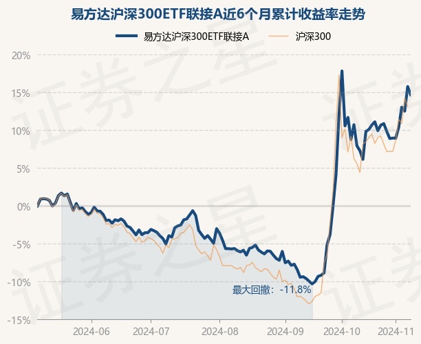 证券之星消息,11月8日,易方达沪深300ETF联接A最新单位净值为1.6135元,累计净值为1.6135元,较前一交易日下跌0.94%。历史数据显示该基金近1个月下跌2.67%,近3个月上涨21.54%,近6个月上涨14.68%,近1年上涨15.47%。该基金近6个月的累计收益率走势如下图: