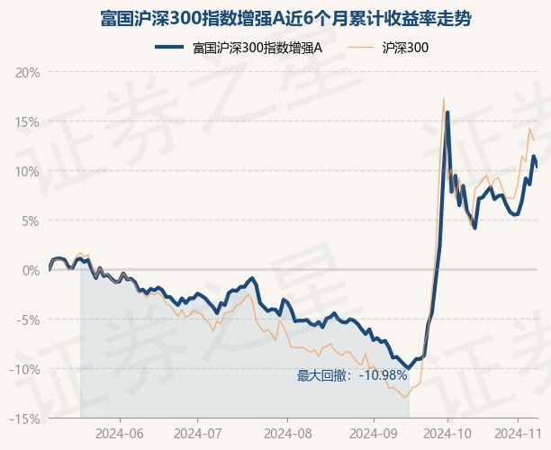 证券之星消息,11月8日,富国沪深300指数增强A最新单位净值为1.622元,累计净值为2.208元,较前一交易日下跌0.92%。历史数据显示该基金近1个月下跌4.7%,近3个月上涨16.36%,近6个月上涨10.42%,近1年上涨12.95%。该基金近6个月的累计收益率走势如下图: