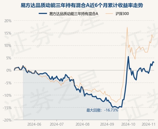证券之星消息,11月8日,易方达品质动能三年持有混合A最新单位净值为0.8474元,累计净值为0.8474元,较前一交易日下跌0.24%。历史数据显示该基金近1个月下跌2.22%,近3个月上涨14.33%,近6个月上涨3.12%,近1年下跌2.34%。该基金近6个月的累计收益率走势如下图: