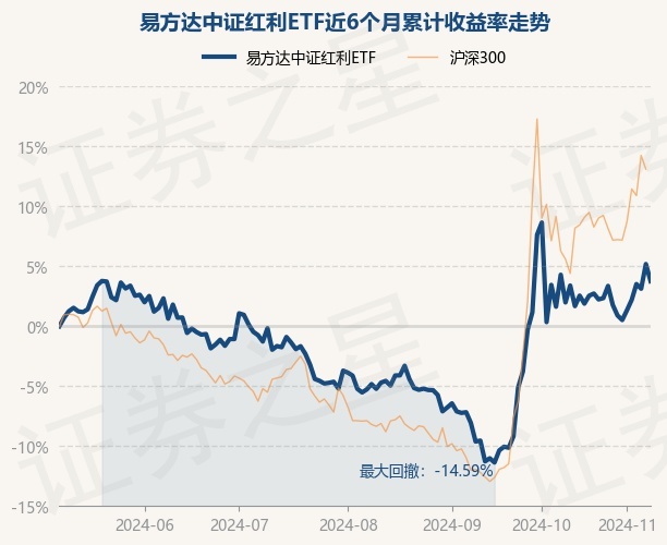 证券之星消息,11月8日,易方达中证红利ETF最新单位净值为1.3579元,累计净值为1.6289元,较前一交易日下跌1.36%。历史数据显示该基金近1个月下跌4.54%,近3个月上涨8.98%,近6个月上涨3.72%,近1年上涨15.51%。该基金近6个月的累计收益率走势如下图: