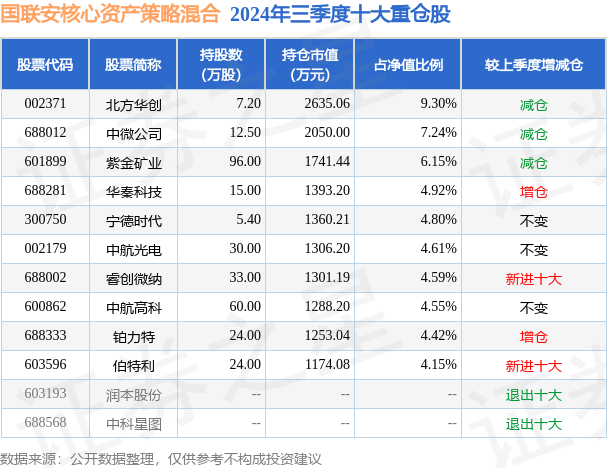 国联安核心资产策略混合为混合型-偏股基金,根据最新一期基金季报显示,该基金资产配置:股票占净值比92.47%,债券占净值比0.57%,现金占净值比5.32%。基金十大重仓股如下: