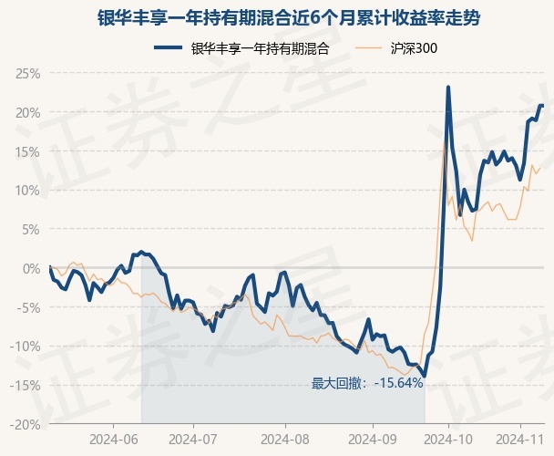 证券之星消息,11月11日,银华丰享一年持有期混合最新单位净值为0.8268元,累计净值为0.8268元,较前一交易日上涨0.0%。历史数据显示该基金近1个月上涨14.55%,近3个月上涨28.46%,近6个月上涨22.24%,近1年上涨1.27%。该基金近6个月的累计收益率走势如下图: