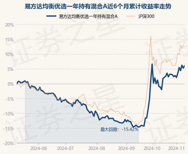 证券之星消息,11月11日,易方达均衡优选一年持有混合A最新单位净值为1.1084元,累计净值为1.1084元,较前一交易日上涨0.73%。历史数据显示该基金近1个月上涨6.09%,近3个月上涨19.83%,近6个月上涨6.05%,近1年上涨8.25%。该基金近6个月的累计收益率走势如下图: