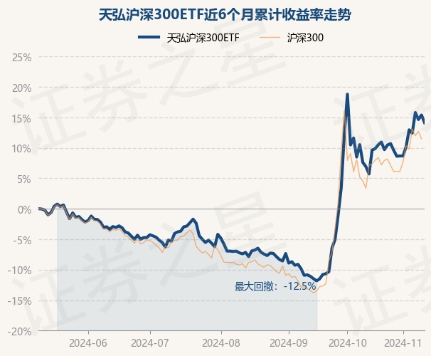 证券之星消息,11月11日,天弘沪深300ETF最新单位净值为1.1564元,累计净值为1.1564元,较前一交易日上涨0.64%。历史数据显示该基金近1个月上涨6.36%,近3个月上涨24.38%,近6个月上涨15.39%,近1年上涨18.01%。该基金近6个月的累计收益率走势如下图: