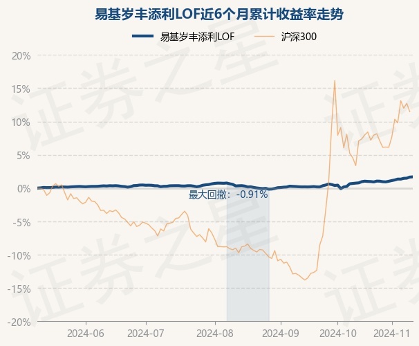 证券之星消息,11月11日,易基岁丰添利LOF最新单位净值为1.6701元,累计净值为2.5811元,较前一交易日上涨0.16%。历史数据显示该基金近1个月上涨1.4%,近3个月上涨1.09%,近6个月上涨1.65%,近1年上涨5.12%。该基金近6个月的累计收益率走势如下图: