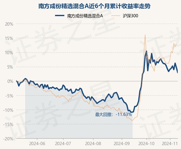 证券之星消息,11月11日,南方成份精选混合A最新单位净值为0.5937元,累计净值为1.9863元,较前一交易日下跌1.59%。历史数据显示该基金近1个月下跌3.1%,近3个月上涨10.64%,近6个月上涨2.97%,近1年下跌0.15%。该基金近6个月的累计收益率走势如下图: