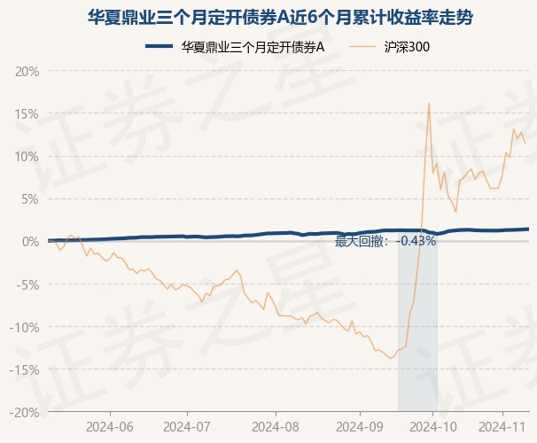 证券之星消息,11月12日,华夏鼎业三个月定开债券A最新单位净值为1.0263元,累计净值为1.0888元,较前一交易日上涨0.02%。历史数据显示该基金近1个月上涨0.4%,近3个月上涨0.7%,近6个月上涨1.37%,近1年上涨3.34%。该基金近6个月的累计收益率走势如下图: