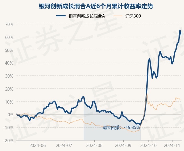 证券之星消息,11月12日,银河创新成长混合A最新单位净值为6.3838元,累计净值为6.3838元,较前一交易日下跌2.15%。历史数据显示该基金近1个月上涨26.24%,近3个月上涨57.5%,近6个月上涨61.58%,近1年上涨35.92%。该基金近6个月的累计收益率走势如下图:
