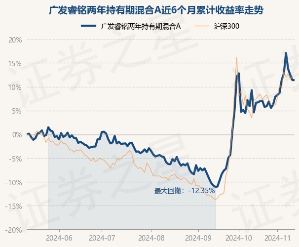 证券之星消息,11月13日,广发睿铭两年持有期混合A最新单位净值为1.0368元,累计净值为1.0368元,较前一交易日上涨0.0%。历史数据显示该基金近1个月上涨5.86%,近3个月上涨17.97%,近6个月上涨10.57%,近1年上涨23.71%。该基金近6个月的累计收益率走势如下图: