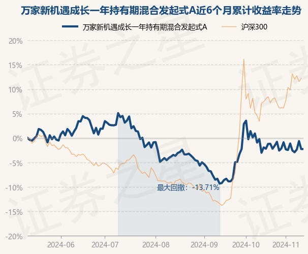 证券之星消息,11月13日,万家新机遇成长一年持有期混合发起式A最新单位净值为0.8759元,累计净值为0.8759元,较前一交易日上涨0.0%。历史数据显示该基金近1个月下跌2.72%,近3个月上涨0.88%,近6个月下跌2.6%,近1年上涨6.2%。该基金近6个月的累计收益率走势如下图: