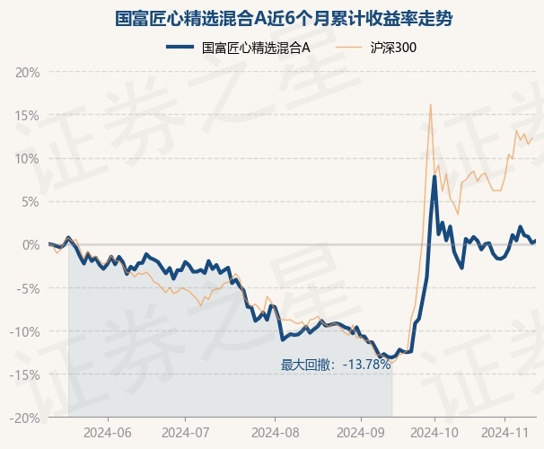 证券之星消息,11月13日,国富匠心精选混合A最新单位净值为0.9238元,累计净值为0.9238元,较前一交易日上涨0.25%。历史数据显示该基金近1个月下跌0.05%,近3个月上涨10.98%,近6个月上涨0.37%,近1年上涨10.4%。该基金近6个月的累计收益率走势如下图: