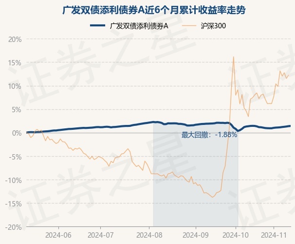 证券之星消息,11月13日,广发双债添利债券A最新单位净值为1.2169元,累计净值为1.6398元,较前一交易日上涨0.04%。历史数据显示该基金近1个月上涨0.61%,近3个月下跌0.39%,近6个月上涨1.42%,近1年上涨5.19%。该基金近6个月的累计收益率走势如下图: