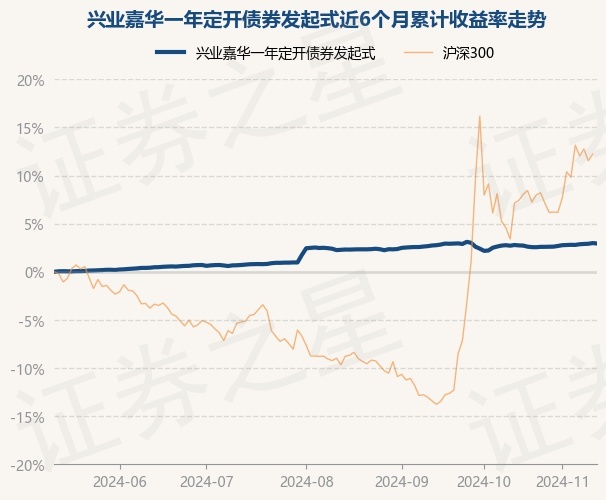 证券之星消息,11月13日,兴业嘉华一年定开债券发起式最新单位净值为1.0349元,累计净值为1.1819元,较前一交易日下跌0.04%。历史数据显示该基金近1个月上涨0.31%,近3个月上涨0.64%,近6个月上涨2.94%,近1年上涨6.19%。该基金近6个月的累计收益率走势如下图: