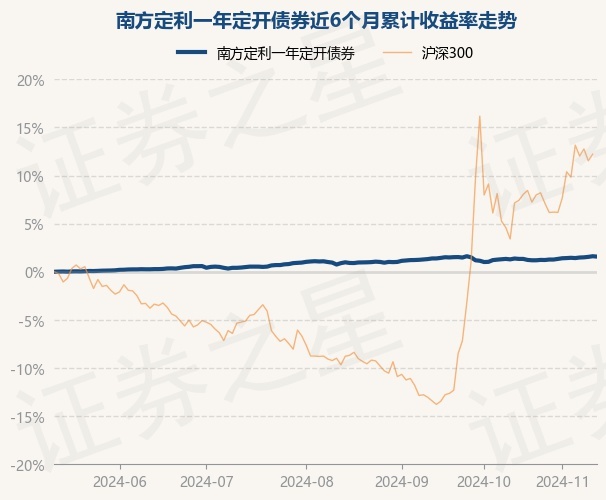 证券之星消息,11月13日,南方定利一年定开债券最新单位净值为1.0631元,累计净值为1.0931元,较前一交易日下跌0.04%。历史数据显示该基金近1个月上涨0.31%,近3个月上涨0.67%,近6个月上涨1.58%,近1年上涨3.92%。该基金近6个月的累计收益率走势如下图: