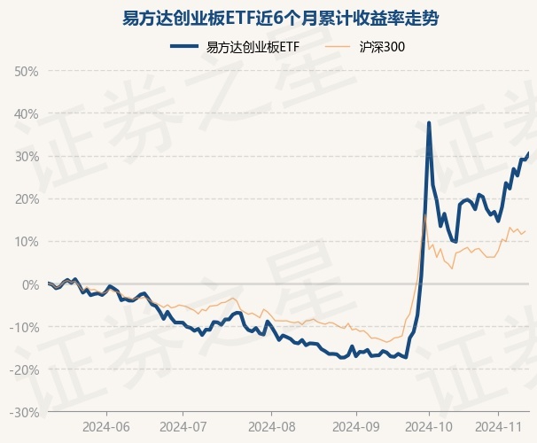 证券之星消息,11月13日,易方达创业板ETF最新单位净值为2.3711元,累计净值为2.7163元,较前一交易日上涨1.1%。历史数据显示该基金近1个月上涨15.0%,近3个月上涨50.35%,近6个月上涨30.42%,近1年上涨21.14%。该基金近6个月的累计收益率走势如下图: