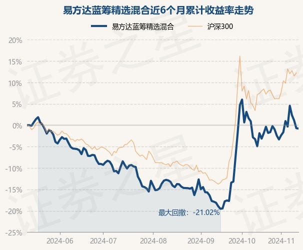 证券之星消息,11月13日,易方达蓝筹精选混合最新单位净值为1.8312元,累计净值为1.8312元,较前一交易日下跌0.09%。历史数据显示该基金近1个月下跌2.39%,近3个月上涨14.33%,近6个月下跌0.79%,近1年下跌4.31%。该基金近6个月的累计收益率走势如下图: