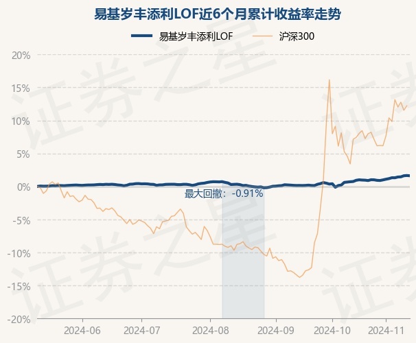 证券之星消息,11月13日,易基岁丰添利LOF最新单位净值为1.6701元,累计净值为2.5811元,较前一交易日下跌0.04%。历史数据显示该基金近1个月上涨1.4%,近3个月上涨1.3%,近6个月上涨1.62%,近1年上涨5.1%。该基金近6个月的累计收益率走势如下图: