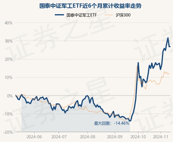 证券之星消息,11月13日,国泰中证军工ETF最新单位净值为1.1696元,累计净值为1.1696元,较前一交易日上涨0.03%。历史数据显示该基金近1个月上涨21.05%,近3个月上涨33.71%,近6个月上涨26.79%,近1年上涨16.27%。该基金近6个月的累计收益率走势如下图:
