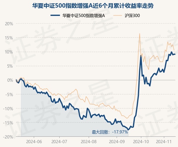 证券之星消息,11月14日,华夏中证500指数增强A最新单位净值为1.893元,累计净值为1.893元,较前一交易日上涨0.0%。历史数据显示该基金近1个月上涨5.67%,近3个月上涨22.66%,近6个月上涨6.63%,近1年上涨11.05%。该基金近6个月的累计收益率走势如下图: