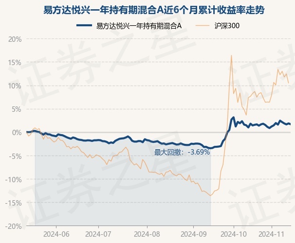 证券之星消息,11月14日,易方达悦兴一年持有期混合A最新单位净值为1.0258元,累计净值为1.0258元,较前一交易日下跌0.17%。历史数据显示该基金近1个月下跌0.63%,近3个月上涨4.43%,近6个月上涨1.69%,近1年上涨3.47%。该基金近6个月的累计收益率走势如下图: