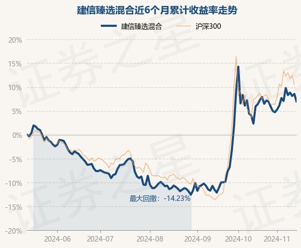 证券之星消息,11月14日,建信臻选混合最新单位净值为0.8659元,累计净值为0.8659元,较前一交易日下跌1.46%。历史数据显示该基金近1个月下跌0.23%,近3个月上涨20.72%,近6个月上涨6.98%,近1年上涨7.29%。该基金近6个月的累计收益率走势如下图: