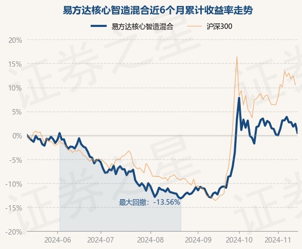 证券之星消息,11月14日,易方达核心智造混合最新单位净值为0.884元,累计净值为0.884元,较前一交易日下跌1.84%。历史数据显示该基金近1个月下跌2.48%,近3个月上涨14.01%,近6个月上涨0.52%,近1年上涨17.19%。该基金近6个月的累计收益率走势如下图: